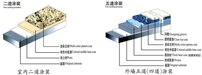 A、平面:墻體處理/外墻專用膩子一底涂/水性外墻抗堿封閉底漆(透明)一中底涂/水性外墻有色底漆(調色)—中涂/水性多彩崗巖漆主材一面涂/水性透明面漆